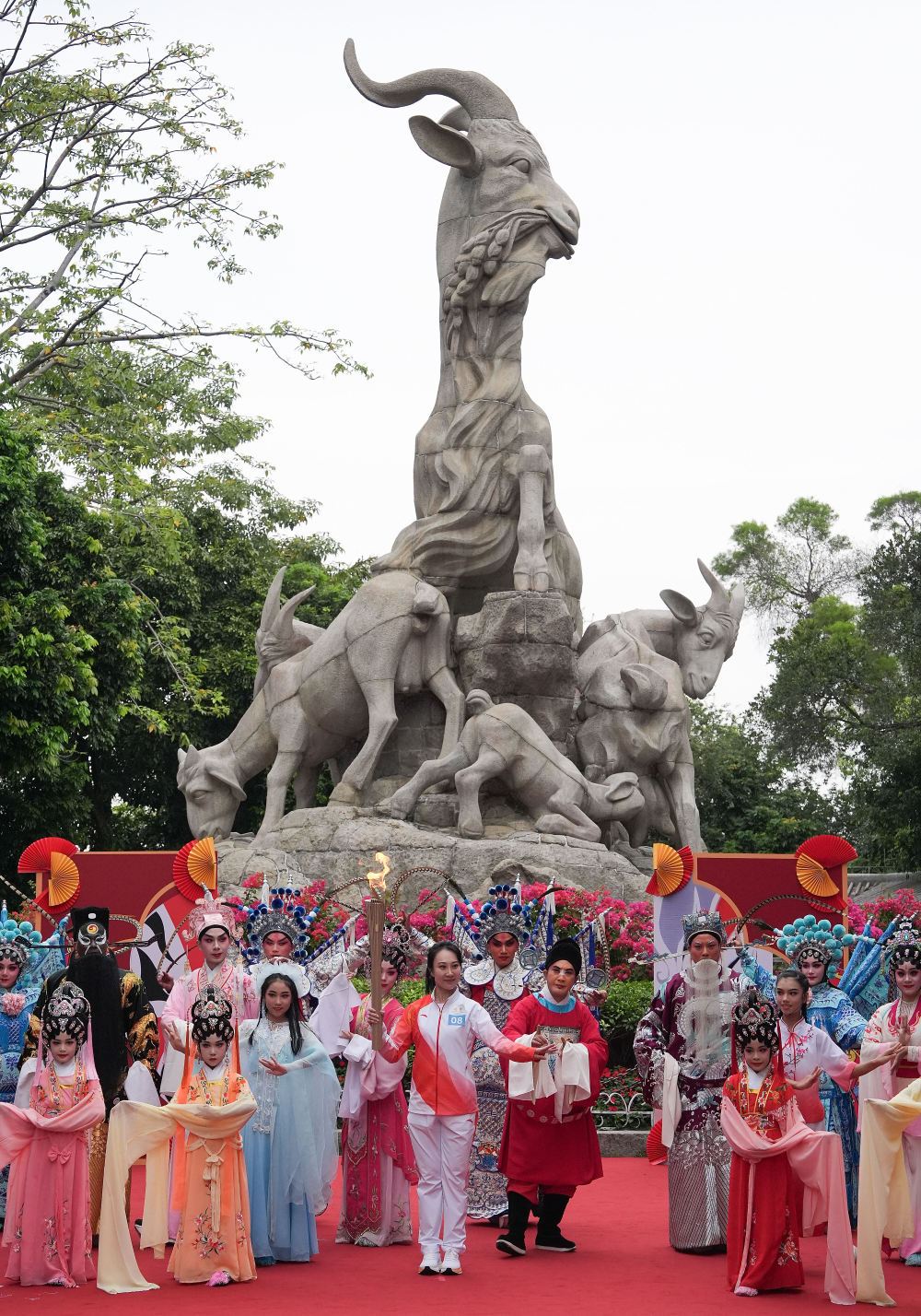 ↑ 火炬手李嘉宜(中)在廣州越秀公園內的五羊雕像前傳遞火炬。新華社記者 杜宇 攝