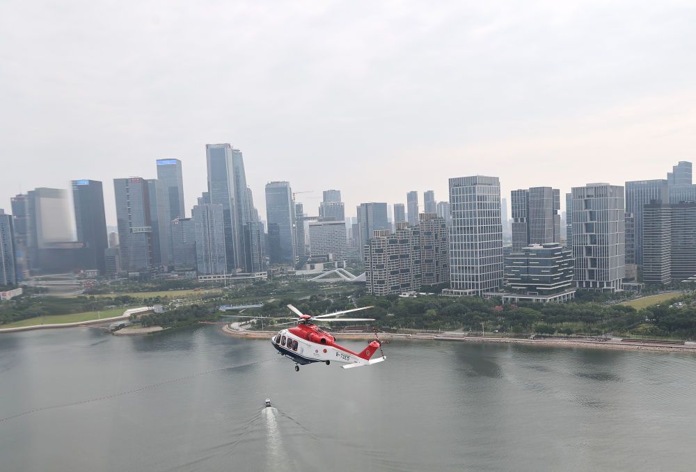 ↑ 搭載圣火的直升機進行空中傳遞。新華社記者 江漢 攝