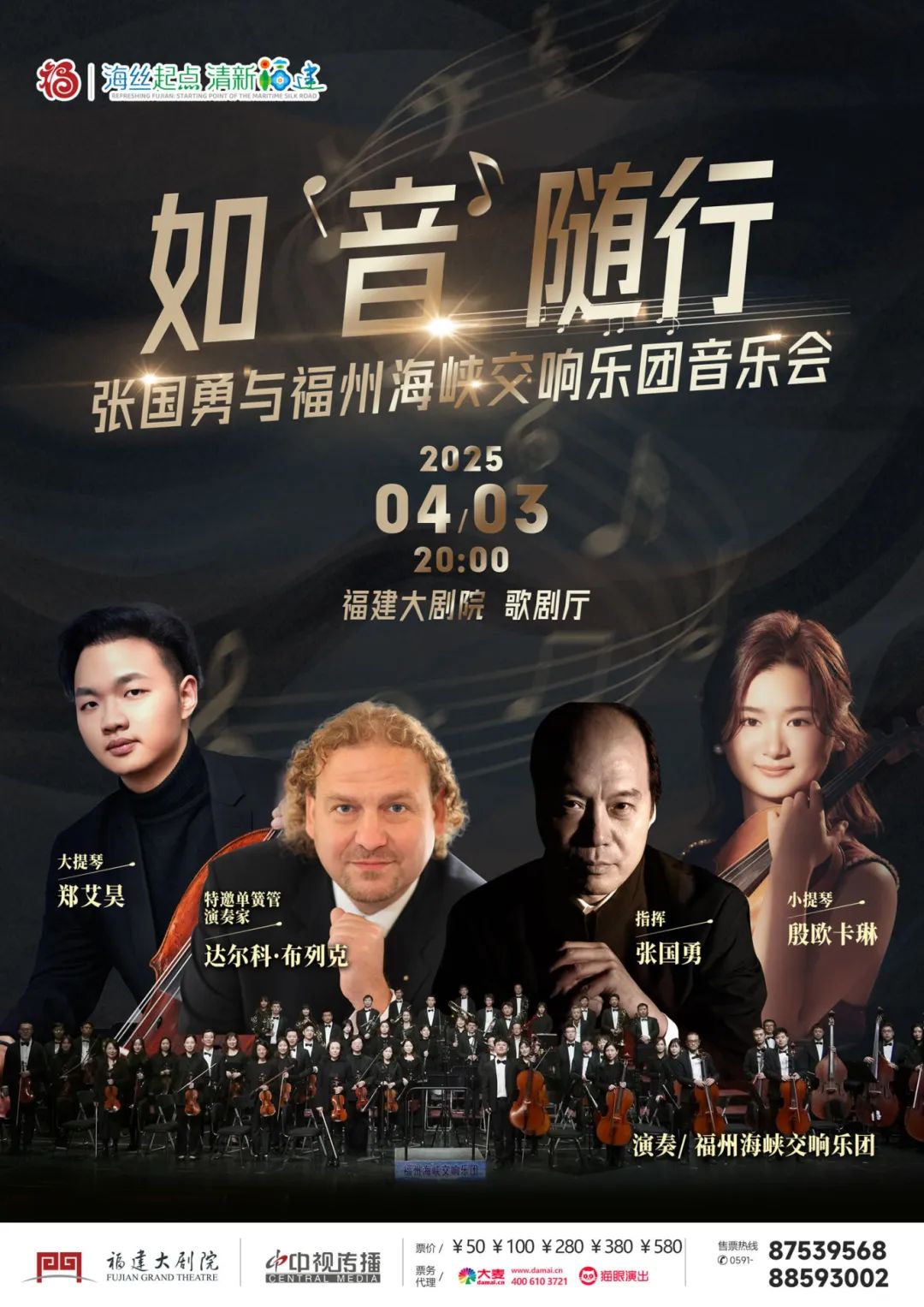 《如“音”隨行——張國勇與福州海峽交響樂團音樂會》 時間: 4月3日 20:00 地點: 福建大劇院歌劇廳 演出單位: 福建省歌舞劇院、福州海峽交響樂團