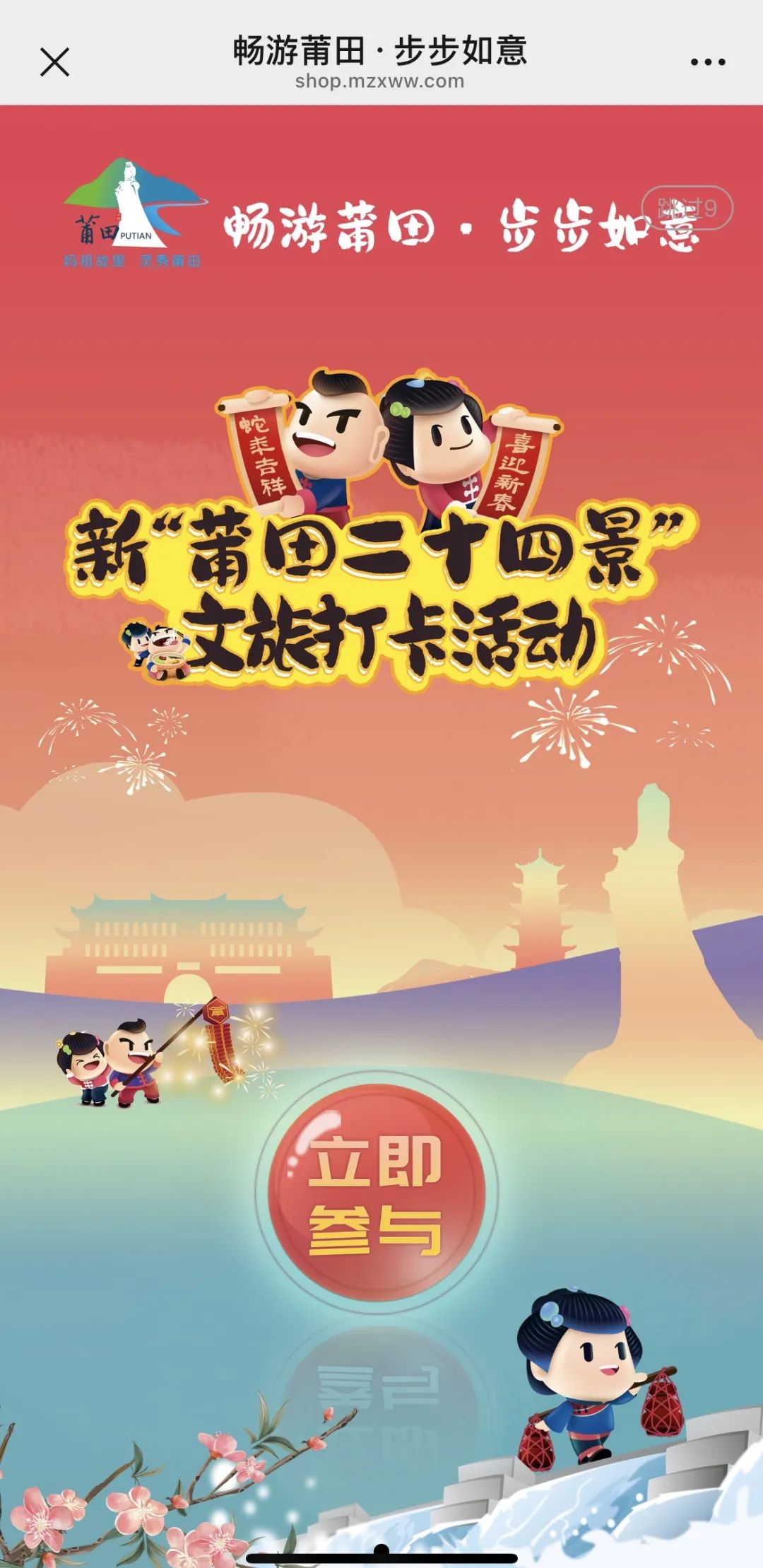 新“莆田二十四景”文旅打卡系列活動暨“惠見莆田˙暢游國家歷史文化名城”文旅融合發展新業態消費活動 時間: 4月-獎品送完即止 地點: 莆田市