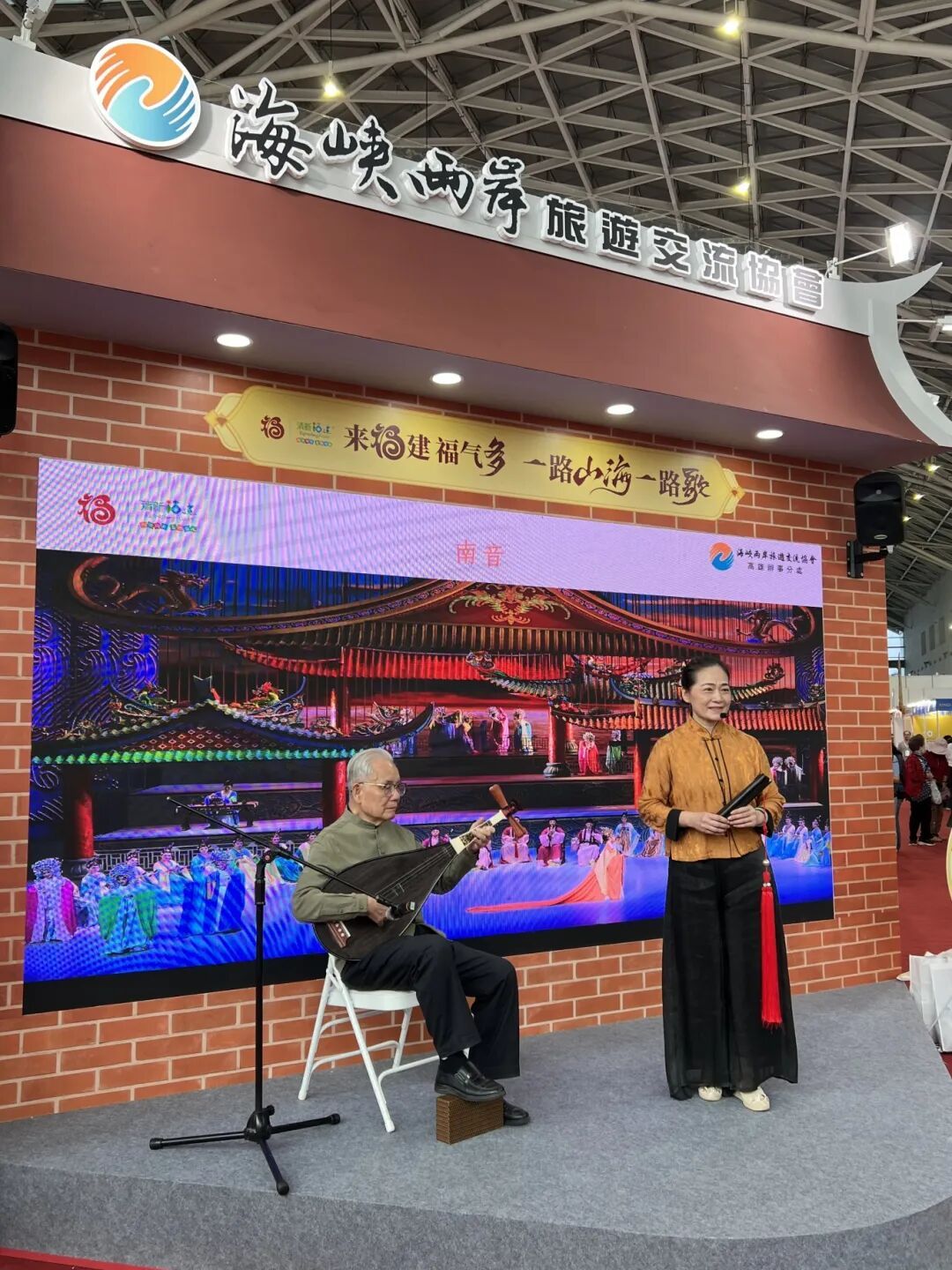 本次旅展,海旅會展區整體設計以閩南紅磚古厝元素為主,巧妙設置了泉州特色蟳埔蠔殼厝和小蟳女打卡區,充滿著閩南濃濃鄉情味。莆田媽祖雕像和鼓浪嶼鄭成功雕像兩張巨幅圖像分立入口兩側,六幅展現福建木板年畫、南音、漆藝、簪花、布袋木偶和京劇等非遺元素的紗縵圖,搭配空中朵朵盛開的福州油紙傘,讓人眼前一亮。