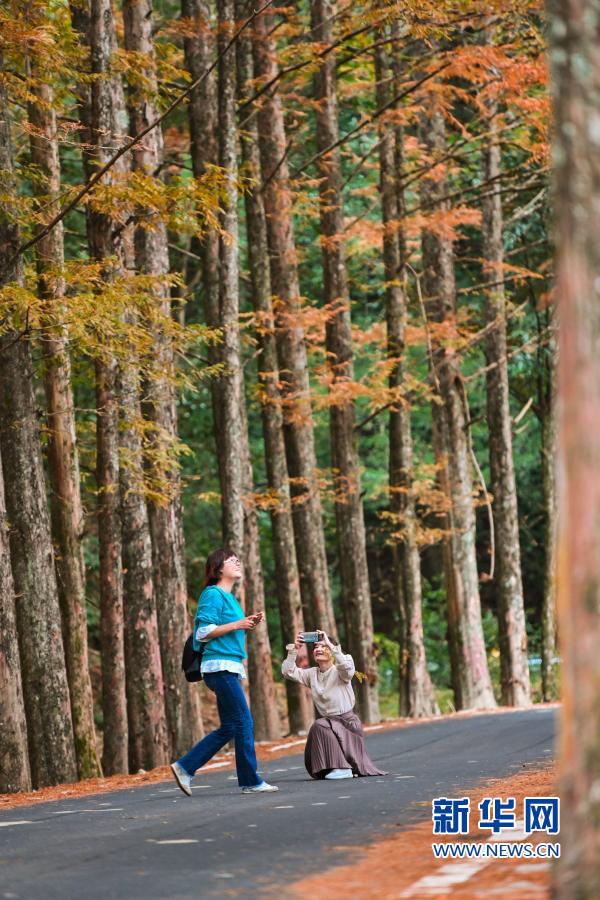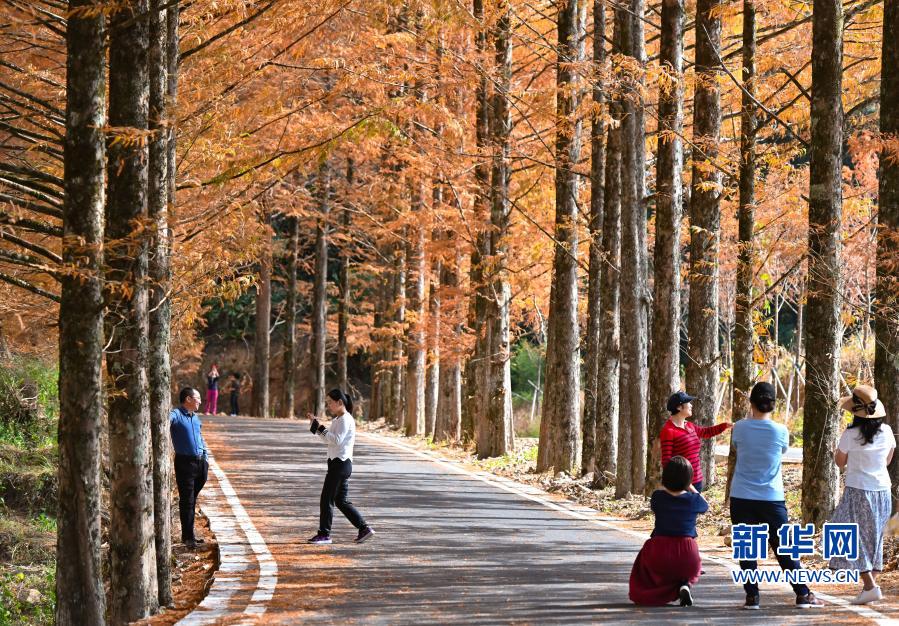 11月19日,游客在福建省三明市將樂縣國家級自然保護(hù)區(qū)水杉大道游覽。新華社記者 宋為偉 攝