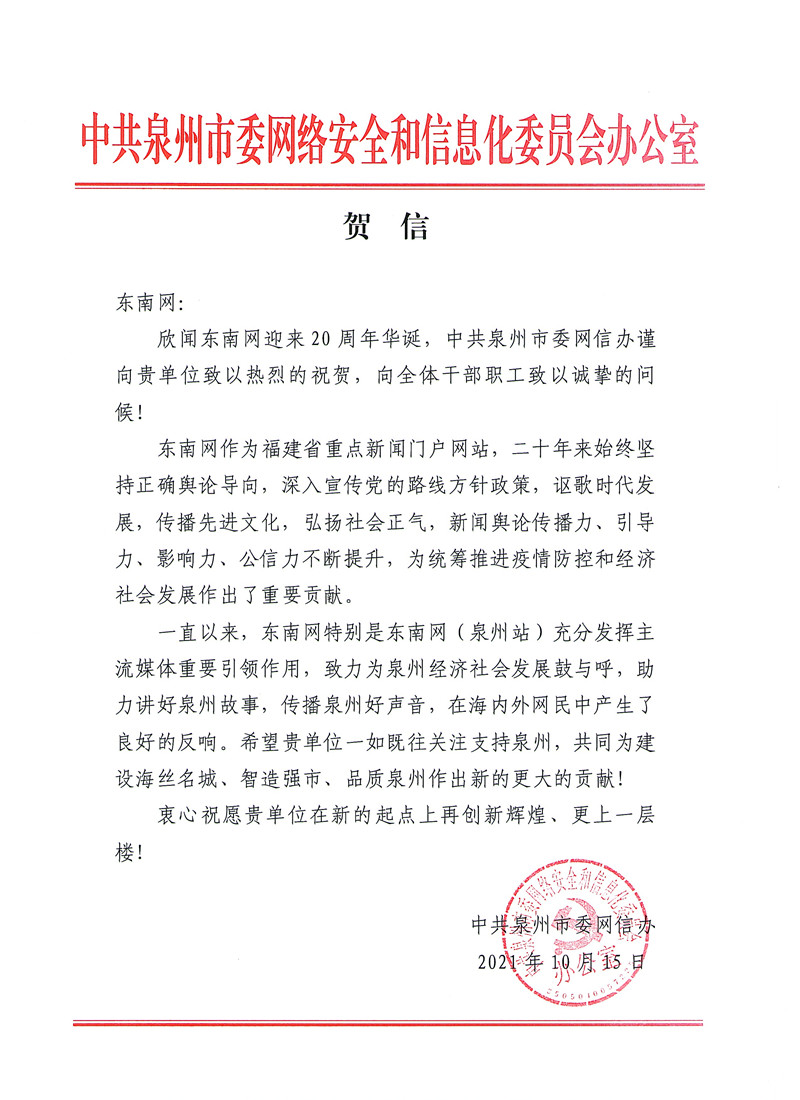 中共泉州市委網絡安全和信息化委員會辦公室賀信